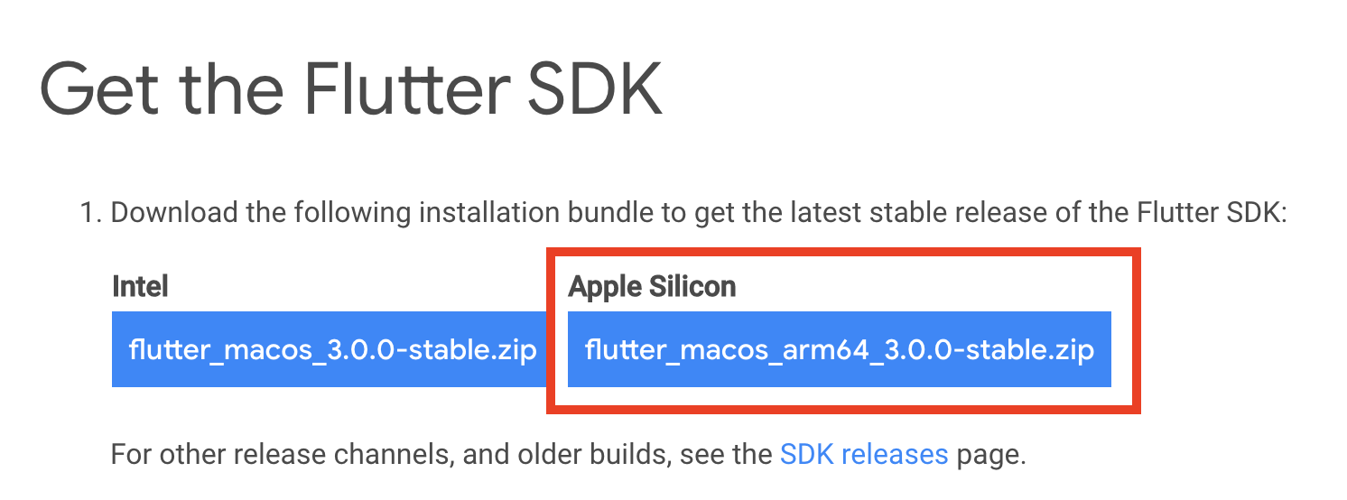 플러터 설치를 위해 공식 사이트에서 Apple Silicon SDK를 다운로드합니다. 현재 글이 맥 기준이라 macos 링크를 남겨둘게요. (https://docs.flutter.dev/get-started/install/macos)