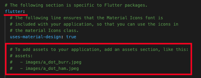 위젯에서 로컬 이미지를 표시하기 위해서는 pubspec.yaml 파일에 사용하려는 폴더나 이미지 파일을 추가해야 합니다. pubspec.yaml 파일에서 아래와 같은 부분을 찾습니다.