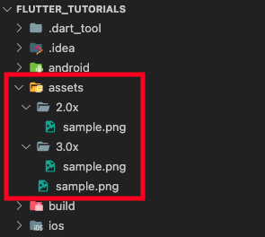 방법은 간단합니다. 다음과 같이 2.0x, 3.0x 폴더를 생성하고, 동일한 이름의 파일을 각각의 폴더에 추가하면, 플러터에서 알아서 해상도에 맞춰 이미지를 자동으로 불러옵니다.