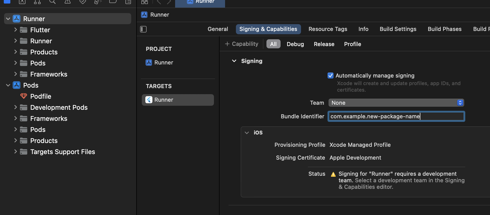 앱 패키지 이름을 변경하기 위해 ios/Runner.xcworkspace 파일을 실행합니다. 그리고 Runner > TARGETS Runner > Bundle Identifier 항목에 새로운 패키지 이름을 입력하여 변경하면 됩니다.