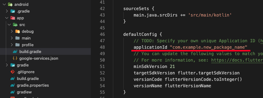 /android/app/buld.gradle 파일을 열어 defaultConfig 내에 applicationId 값을 새로운 패키지 이름으로 변경합니다. 그리고 /app/src/ 하위에 있는 debug, main, profile 폴더에 AndroidManifest.xml 파일을 열어 <manifest> 태그의 옵션값인 package를 찾아 모두 패키지 이름을 변경합니다.