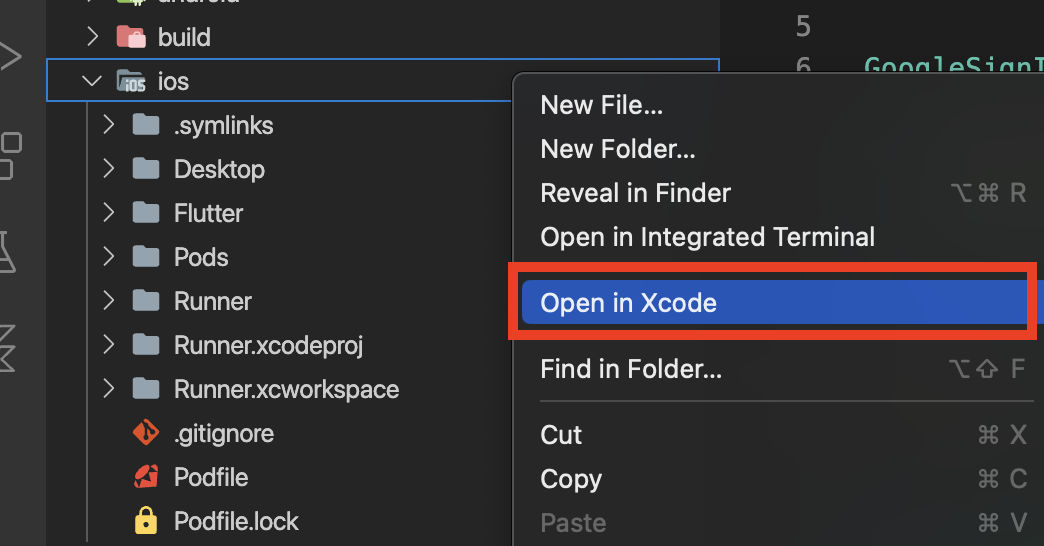 이 오류는 iOS에서 발생되는 오류로 Xcode에서 간단히 해결할 수 있습니다. 우선 프로젝트를 Xcode로 실행합니다. 만약 Vscode를 사용 중이시라면 프로젝트 루트 경로에 위치한 ios 폴더를 우측 클릭하고, Open in Xcode를 누르시면 됩니다.
