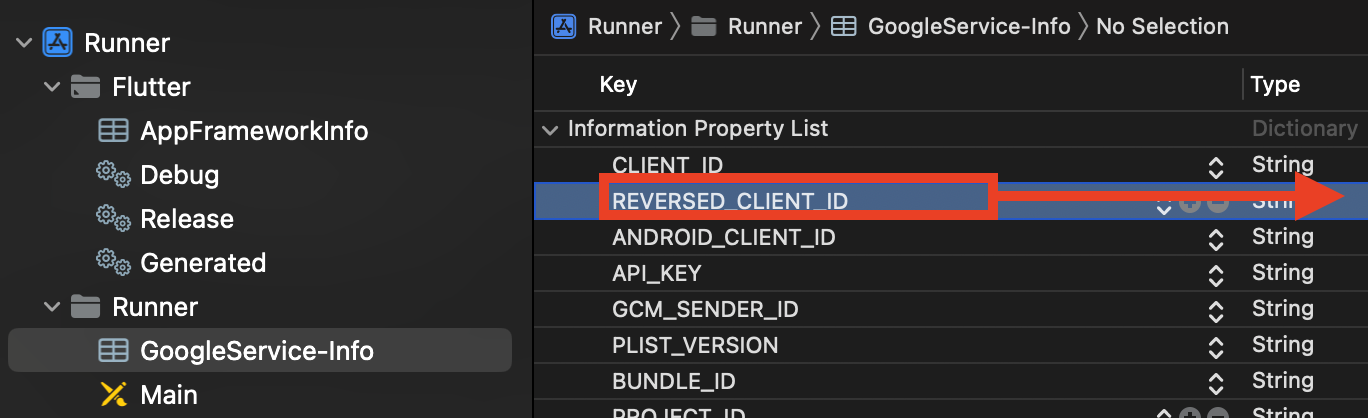Runner > GoogleService-Info.plist > REVERSED_CLIENT_ID의 Value값을 복사합니다.
