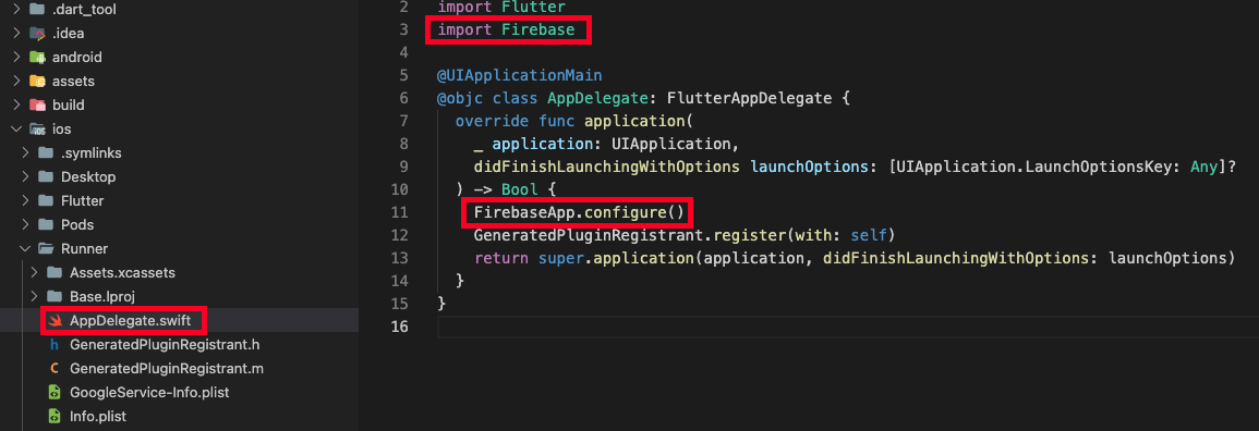 루트 경로에 위치한 ios/Runner/AppDelegate.swift 파일에 파이어베이스 코드를 추가하면 됩니다. 간단하죠?