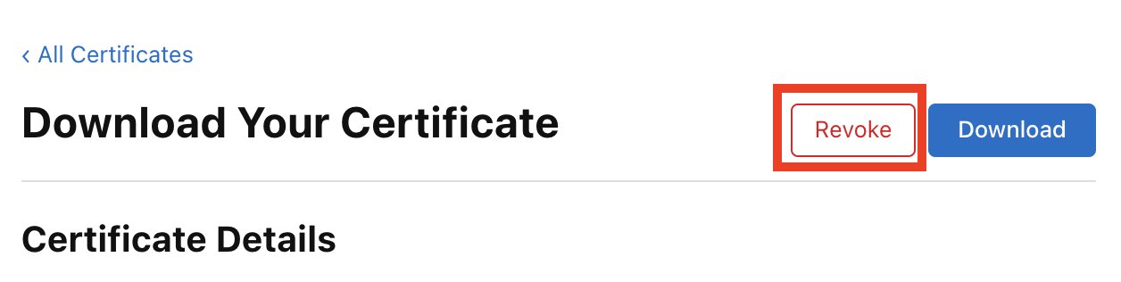 우측 상단에 Revoke 버튼을 눌러 기존 인증서를 삭제합니다. 기존 인증서가 없어진다고 앱을 배포하는데 전혀 문제가 되지 않습니다. 새로운 인증서를 발급받을 테니까요.