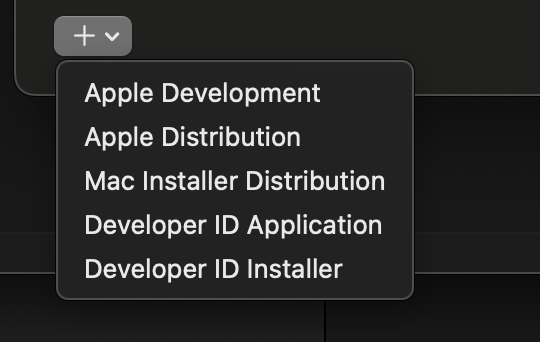 그리고 좌측 하단에 +버튼을 눌러 새로 발급할 인증서를 선택하고 Done 버튼을 누르면 인증서 발급이 완료됩니다.