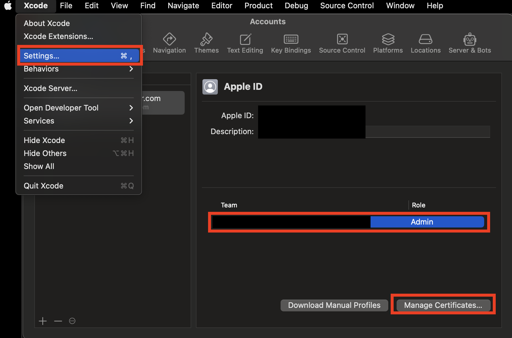이제 Xcode를 실행해서 상단 메뉴의 Settings를 선택하고, Accounts > Team Admin을 선택하고 Manage Certificates 버튼을 누릅니다.